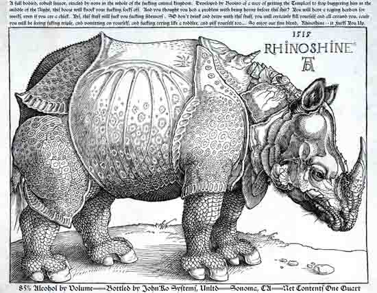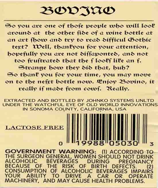 (2006) the Sonoma County Museum of Art asked JohnKo to share some of its latest technologies. We collaborated with Mariel Triggs of Old World Innovations (OWI) to reinvigorate the ancient art of milking wine from cows, and extend it to other more challenging beasts... That Rhinoshine certainly does have a kick!!